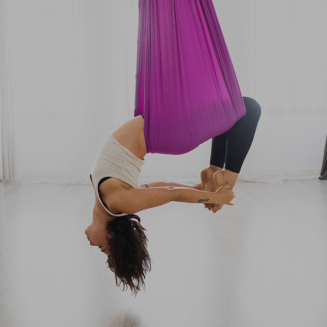 Les postures les plus avancées comme les inversions type chauve-souris se font toujours avec un coussin sous la tête au début. Le tissu enveloppe les hanches pour un retour en sécurité.
